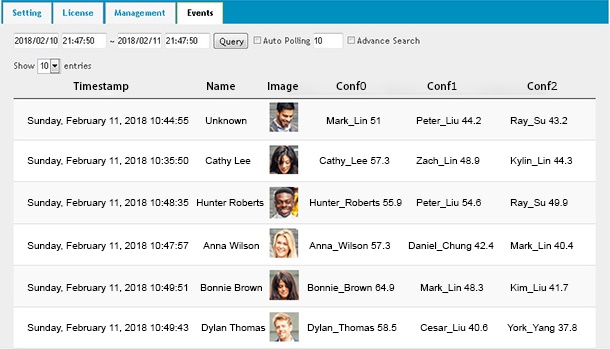 Cơ sở dữ liệu khuôn mặt được tích hợp sẵn trong thân máy và chỉ máy ảnh có thể thực hiện xác thực khuôn mặt. Có thể điều khiển đóng mở cửa theo kết quả xác thực.